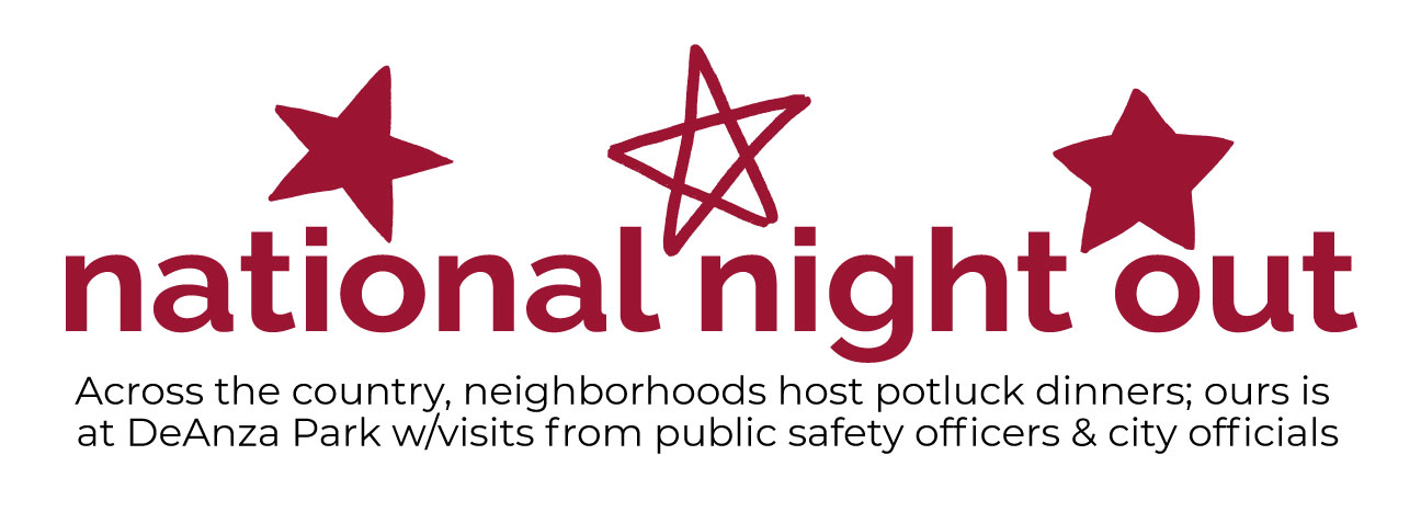 Held the first Tuesday in August, National Night Out is unique crime/drug prevention event that brings together citizens, law enforcement agencies, neighborhood organizations and local officials to strengthen police-community partnerships. We host a potluck picnic dinner at De Anza Park with games, a raffle, and visits from Sunnyvale DPS and city council members.